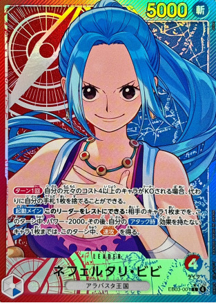 このカードは、アラバスタ王国の王女・ビビをリーダーとして描いた特別仕様のカードです。高潔で優しい彼女の性格を象徴するデザインと能力が融合し、見た目も性能もトップクラスとなっています。背景のコンパスと青い光が、仲間を導くリーダーとしての存在感を際立たせており、圧倒的な美しさと品格を備えた1枚として注目度の高いカードとなっています!
