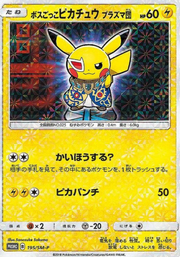 - ボスごっこピカチュウ プラズマ団は、2018年1月20日に「レインボーロケット団の野望キャンペーン」で拡張パック5パック購入ごとに全7種の中からランダムで1枚配布されたポケモンカード