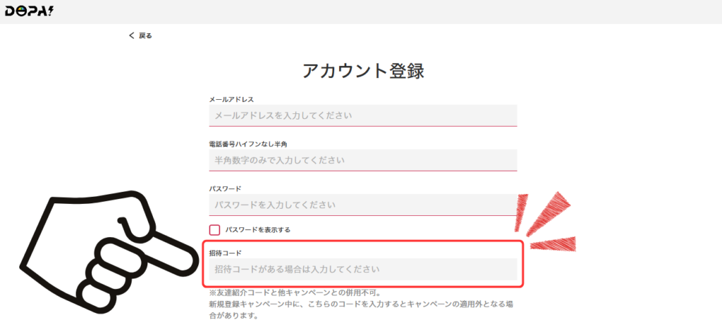 新規会員登録をする際「メールアドレスで登録」をすることで入力できるのが「招待コード」です。