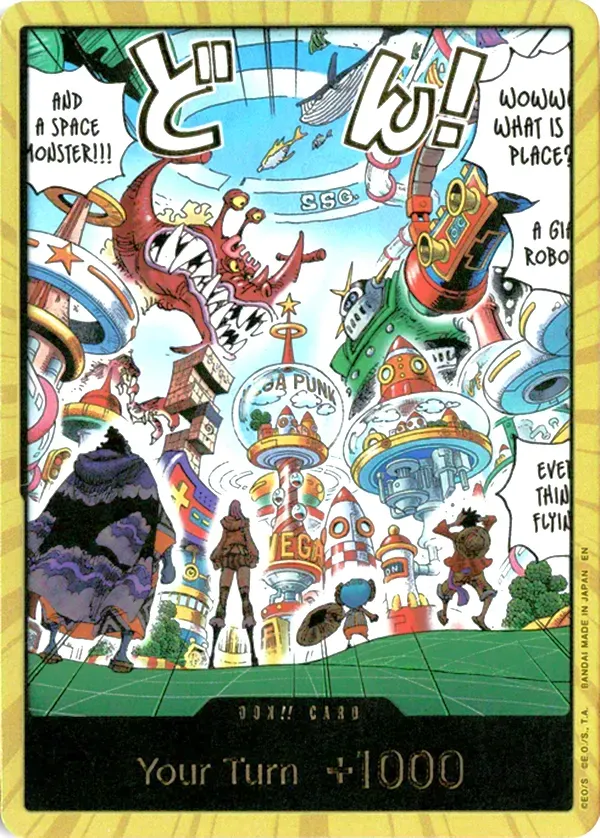 スーパーパラレル仕様のドンカードは、通常のドンカードとは異なる特別なデザインが施されており、封入率も低く高い希少性を持っています。未来島エッグヘッドをモチーフにした本カードは、近未来的な世界観が強く表現されており、原作ファンからの評価も高いのが特徴です。対戦で必須となるドンカードであることから、実用性とコレクション性の両面で需要が集まりやすい1枚です!