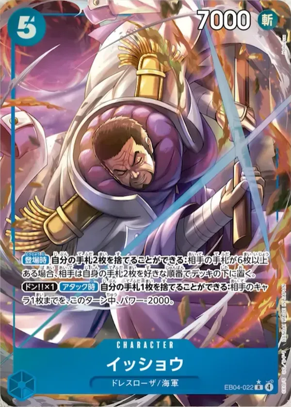 R-Pは通常のレアカードとは異なるパラレル仕様で、封入率が低く希少性のあるレアリティとして扱われています。イッショウは作中でも存在感の強いキャラクターで、重厚なビジュアルや能力設定から根強い人気があります。そのため、パラレル仕様での収録はコレクション面でも注目されやすく、EGGHEAD CRISIS関連カードの中でも需要が集まりやすい1枚です!