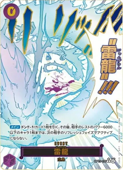このカードは、空島編で描かれた“雷龍”をモチーフにしたR-P仕様のイベントカードです。エネルの能力を象徴する巨大な雷龍を大胆にあしらったビジュアルは迫力満点で、通常版とは異なる淡色ベースの特別加工が高いコレクション性を生み出しています。効果はドン!!-1でカードを1枚引きつつ、相手のレスト状態のパワー6000以下のキャラ1体を次のリフレッシュフェイズでアクティブにさせない妨害性能を持つのが特徴。盤面制圧を補助するテクニカルな1枚です!