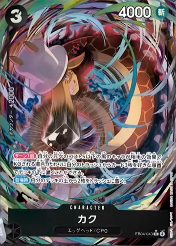 R-Pは通常のレアカードとは異なるパラレル仕様で、封入率が低く希少性のあるレアリティとして扱われています。カクは作中でも印象に残りやすいキャラクターで、個性的なビジュアルや過去シリーズでの活躍から一定の人気があります。そのため、パラレル仕様での収録はコレクション面でも注目されやすく、EGGHEAD CRISIS関連カードの中でも需要が集まりやすい1枚です!