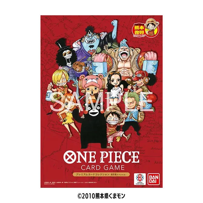 この商品は「ONE PIECE 熊本復興プロジェクト」の一環として熊本県内で販売され、地域復興への想いが込められた記念コレクションです。麦わらの一味が描かれた10種類のドン!!カードを各1枚ずつ収録した特別セットで、ルフィのドン!!カードには、熊本県PRマスコットキャラクター「くまモン」もデザインされています!