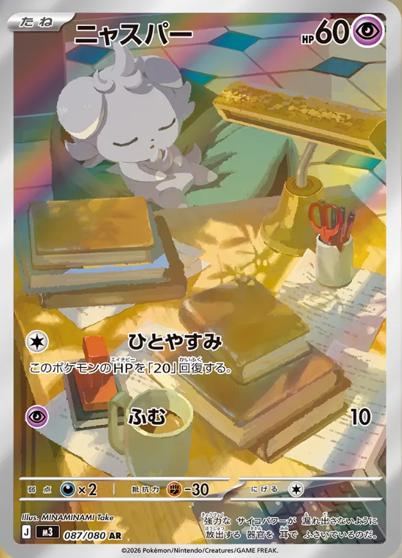 このカードは、AR枠として収録された、イラストの完成度が高いコレクター人気のカードです。イラストでは、ニャスパーが机の上でうとうとと眠っている姿が描かれており、周囲には本やノート、温かそうな飲み物など、生活感のある小物が丁寧に配置されています。柔らかな日差しと静かな空気感が印象的で、癒し系ARとして強い支持を集めやすい1枚です!