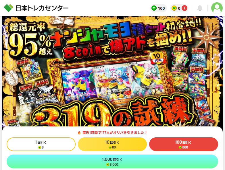 この記事を読んで気になった人は、まずは日本トレカセンターに登録して300コインをもらったうえでオリパを楽しんでみてください!