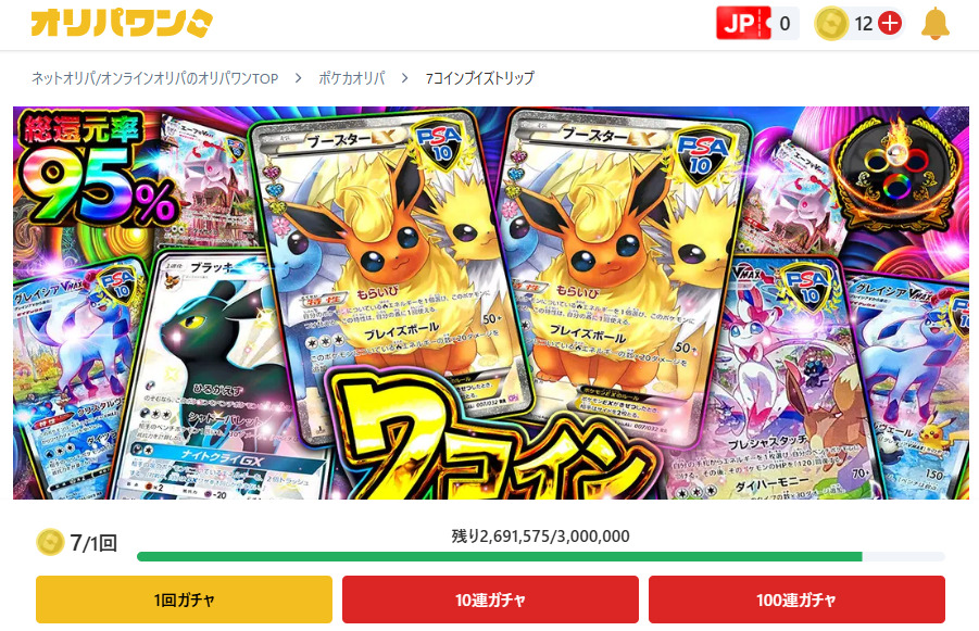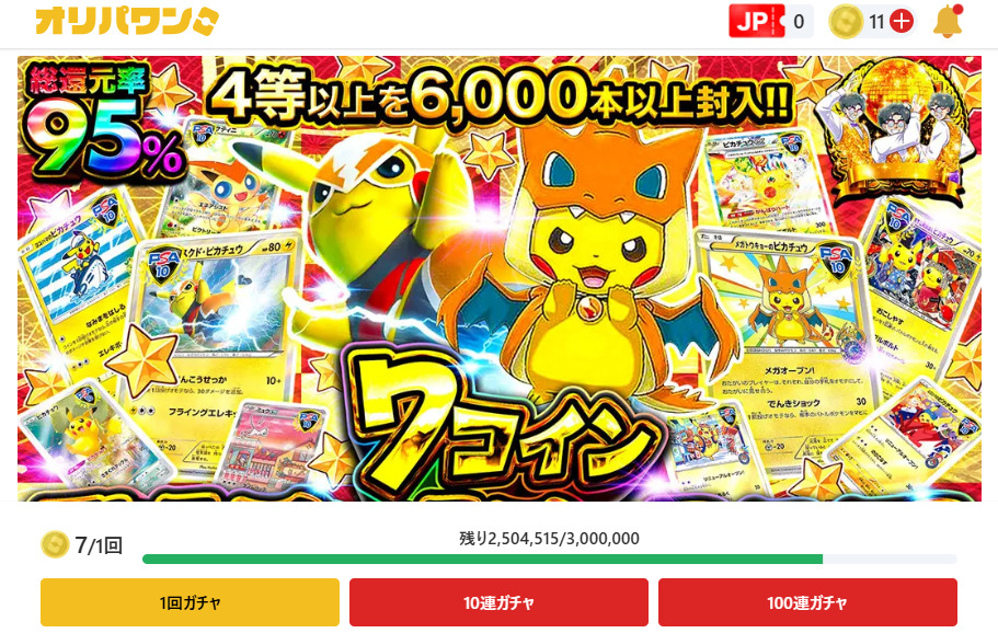 一例として挙げたこのオリパでは、1回7コインで数万円から数十万円するようなカードが当たる可能性があります。