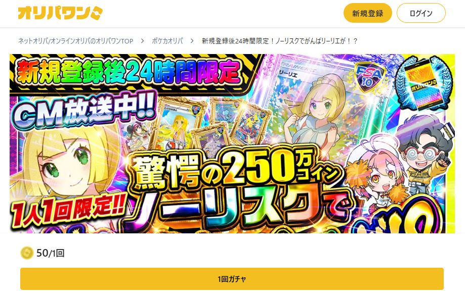 会員登録から24時間や1週間限定、回数限定で超お得なオリパや爆アドなオリパを引くことができます。