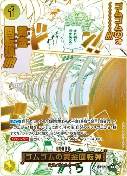 ゴムゴムの黄金回転弾 R-P【神の島の冒険】とは、2026年2月28日(土)に発売された「神の島の冒険」に収録されたワンピースカードです。
