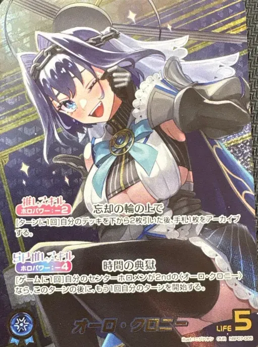 このカードは、LIFE5を持つ推しカードとしてデッキの中心となる存在で、カードの循環や追加ターンといった特徴的な能力を持つ点が魅力です。推しスキル「忘却の輪の上で」はホロパワーを2消費することでデッキの下から2枚を引き、その後手札1枚をアーカイブする効果を持ち、手札を調整しながらデッキを回していくことができます。さらにSP推しスキル「時間の典獄」は、センターホロメンが2ndの〈オーロ・クロニー〉である場合に追加でもう1ターンを開始できる強力な効果を持ち、試合の流れを大きく変える可能性を持つ能力として注目されています!