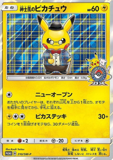 - 紳士風のピカチュウは、2018年3月14日にポケモンセンタートウキョーDX オープン記念「にほんばれキャンペーン」ポケモンセンタートウキョーDXで購入した人に配布されたポケモンカード