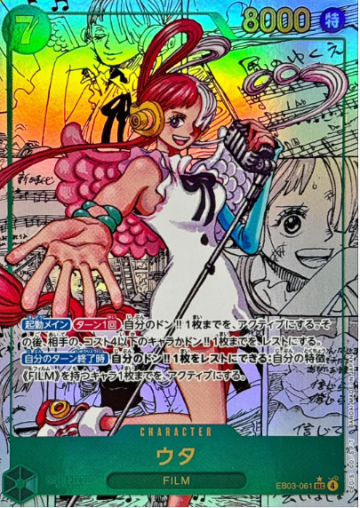 このカードは、映画『FILM RED』の歌姫ウタを象徴する豪華仕様のカードです。ウタは、世界中にその歌声を届ける「新時代の歌姫」として人気を博したキャラクターで、ワンピース史上最も印象的なヒロインとして高い評価を受けています。