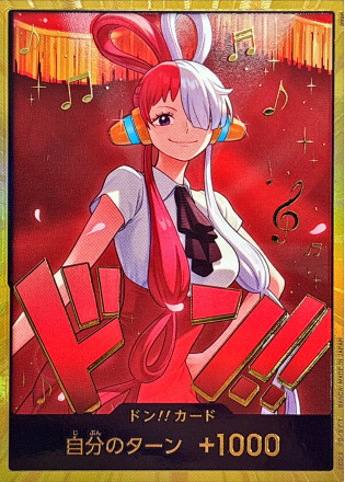 ウタは、映画『ONE PIECE FILM RED』に登場するカリスマ的歌姫で、圧倒的な存在感と切ない物語で多くのファンを魅了し、Adoが歌唱を担当したことで人気は一層高まり、シリーズ全体でも屈指の人気キャラクターです。本カードはスーパーパラレル仕様のドン!!カードで、通常のドン!!カードとは一線を画す豪華加工が施されており、金箔調の縁取りや虹色に輝くホログラム効果により、コレクターからの注目が高いカードとなっています!