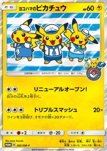• ヨコハマのピカチュウは、2018年11月9日(金)~12月2日(日)にポケモンセンターヨコハマのリニューアルオープン記念で来店者に配布されたポケモンカード